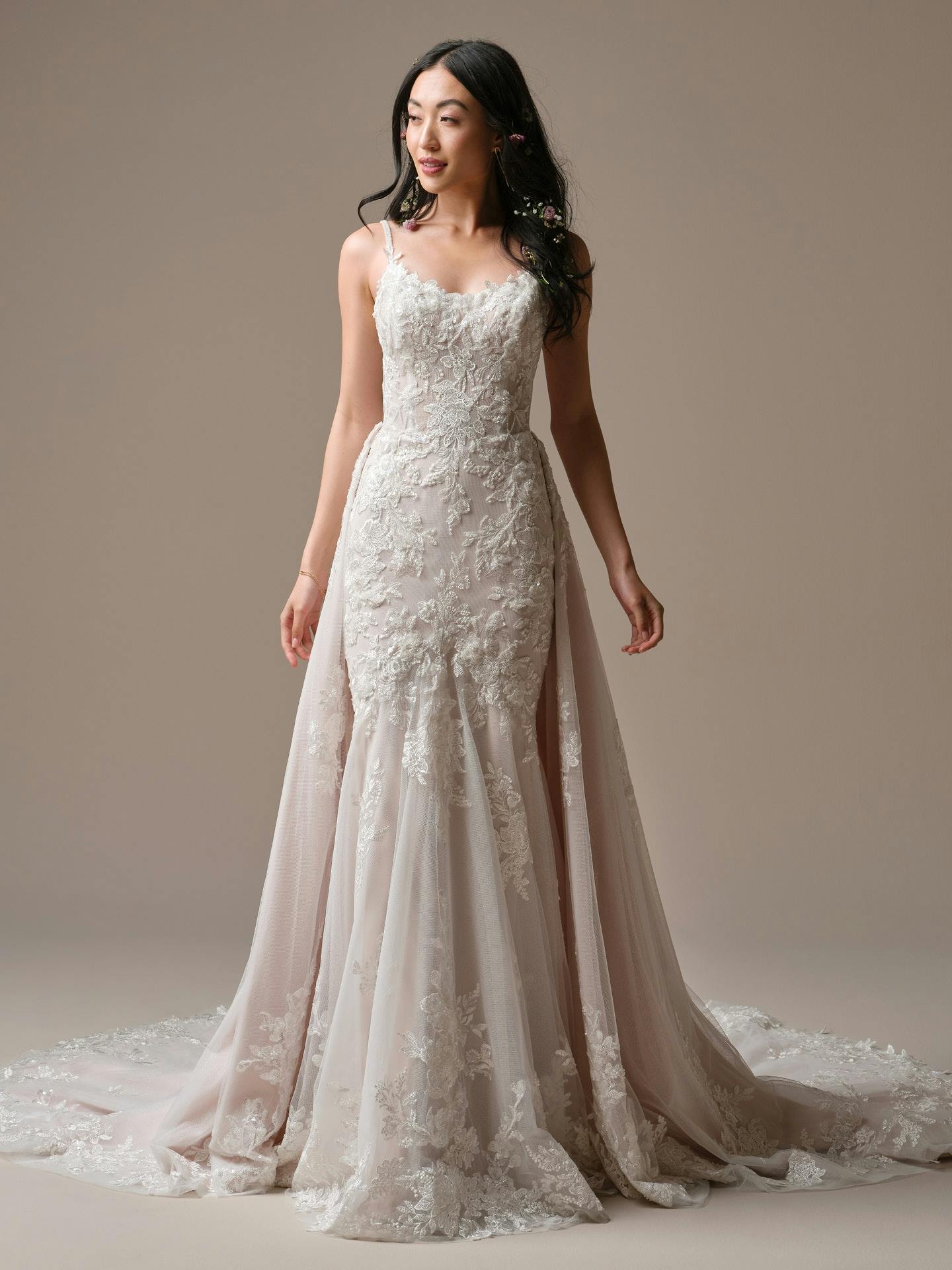 Eden eye-catching scoop neckline illusion lace bodice fit-and-flare wedding dress by Rebecca Ingram with optional detachable lace overskirt.